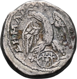 ΔΗΜΑΡ-Χ ΕΞ [VΠΑΤ Π Π]. Adler steht frontal mit ausgebreiteten Schwingen und Kopf n. l., im Schnabel ein Kranz, zwischen seinen Fängen stehen die drei Grazien in einem Kranz.