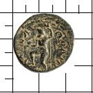 ΑΡCΑ-ΠΟΛΙΝ. Poseidon steht n. r., hält in der r. Hand einen Delfin, stützt sich mit der l. Hand auf einen Dreizack, den r. Fuß auf einen Schiffsbug (prora) gestützt.