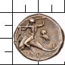 ΤΑ-ΡΑΣ. Delfinreiter n. l., die r. Hand vorgestreckt, mit der zurückgenommenen r. holt er mit dem Dreizack zum Wurf aus; i. F. rechts eine Eule mit angelegten Flügeln n. l. |