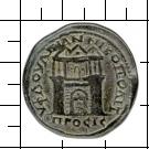 Υ ΦΛ ΟΥΛΠΙΑΝ ΝΙΚΟΠΟΛΙΤ // ΠΡΟC ΙC. Geöffnetes Stadttor flankiert von zwei Türmen; durch das Tor Blick auf einen Tempel mit viersäuliger (tetrastyler) Front; oberhalb des Tores ein dreifach gegliedertes Bauwerk (Mittelbau mit drei bogenartigen Toröffnungen zwischen zwei vorgezogenen Seitenflügeln). |