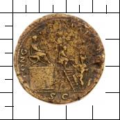 CONG I DAT [POP R] // S C. Nero in Toga sitzt n. r. auf einem Podest; auf einem hinteren Podest sitzt ein Magistrat, der einem Bürger mit Kind Getreide oder Geld (congiarium) reicht; im Hintergrund Minerva frontal mit Blick n. l. mit Eule und Speer and Liberalitas (r.) mit tessera.