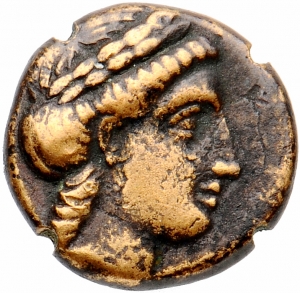 Vorderseite: Kopf des Apollon n. r., lorbeerbekränzt.