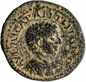 Literatur: A. Spijkerman, The Coins of the Decapolis and Provincia Arabia (1978) Nr. 37; Y. Meshorer, Coins of the Holy Land (2013) Nr. 20; vgl. SNG American Numismatic Society VI Nr. 1420 var. (auf Av. AY KECAP AN[...]).