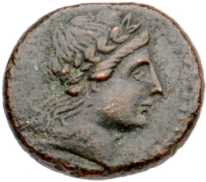 Vorderseite: Kopf des Apollon n. r., lorbeerbekränzt.