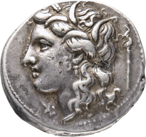 Vorderseite: Kopf der Persephone n. l. mit Ähren bekränzt; rechts i. F. eine brennende Stabfackel.